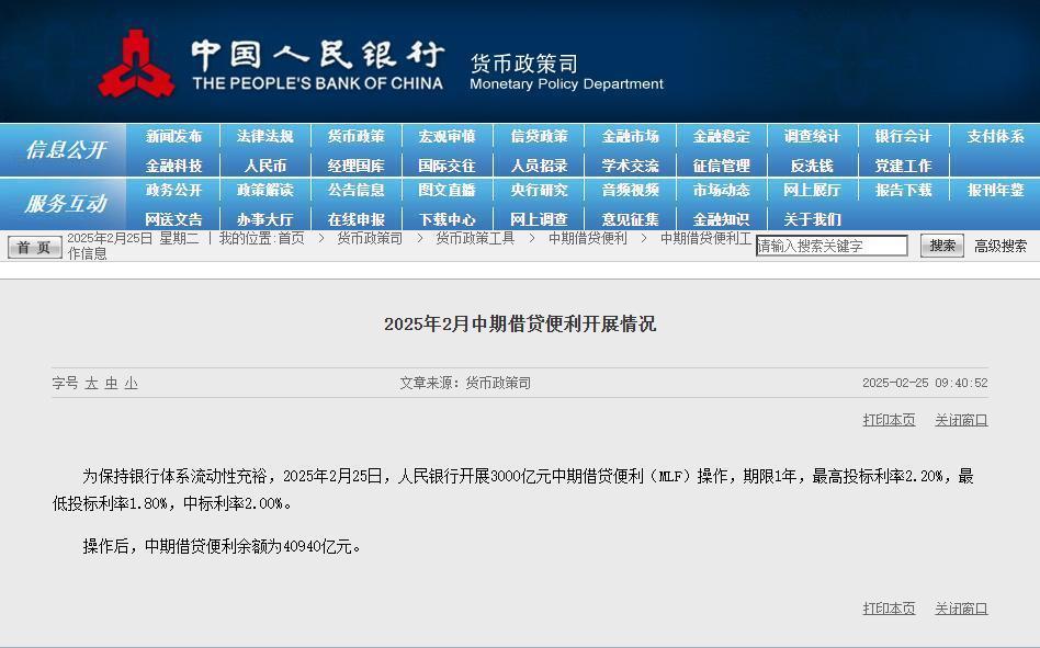 人民网北京2月25日电 (记者罗知之)据中国人民银行官网消息,为保持银行体系流动性充裕,2025年2月25日,人民银行开展3000亿元中期借贷便利(MLF)操作,期限1年,最高投标利率2.20%,最低投标利率1.80%,中标利率2.00%。